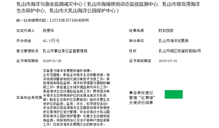 乳山市海洋与渔业监测减灾中心(乳山市海域使用动态监视监测中心、乳山市塔岛湾海洋生态保护中心、乳山市大乳山海洋公园保护中心)